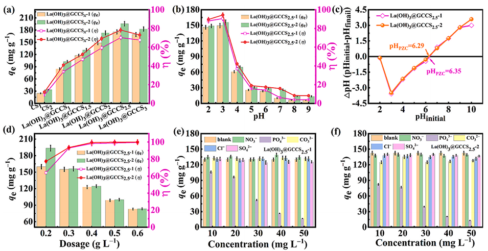 图 3.(a)不同La3+ 添加量下样品的除氟容量和去除效率(初始氟浓度C0=50 mg L-1,温度T=298 K,pH=3,吸附剂投加量为0.2 g L-1,时间t=180 min);(b)pH 值的影响(初始氟浓度C0=33 mg L-1,温度T=298 K,吸附剂投加量为0.2 g L-1,时间t=180 min);(d)吸附剂投加量的影响(初始氟浓度C0=30 mg L-1,温度T=298 K,时间t=180 min);(e、f)共存阴离子的影响(初始氟浓度C0=30 mg L-1,温度T=298 K,吸附剂投加量为0.2 g L-1,时间t=180 min);(c)样品的零电荷点(氯化钠浓度CNaCl=0.1 mol L-1,温度T=298 K,吸附剂投加量为0.2 g L-1,时间t=180 min)。