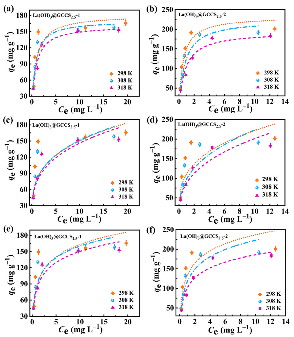 图 4.(a, b)两种吸附剂的 Langmuir 模型拟合;(c, d)Freundlich 模型拟合;(e, f)Temkin 模型拟合(初始氟浓度C0=10−50 mg L-1,pH=3,吸附剂投加量为0.2 g L-1,时间t=180 min)。