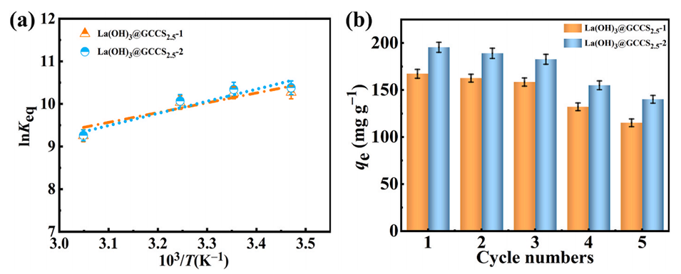 图 6.(a)lnKeq与103/T的关系曲线;(b)La(OH)3@GCCS2.5−1和La(OH)3@GCCS2.5−2微球的再生性能(初始氟浓度C0=50 mg L-1,pH=3,吸附剂投加量为0.2 g L-1,时间t=180 min)。