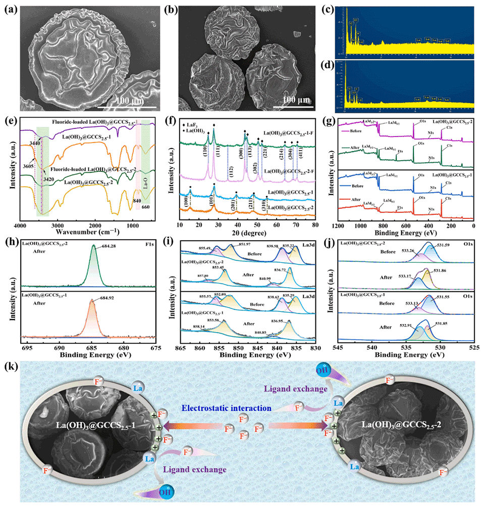 图 7. 吸附后(a)La(OH)3@GCCS2.5−1和(b)La(OH)3@GCCS2.5−2的扫描电镜图像;吸附后(c)La(OH)3@GCCS2.5−1和(d)La(OH)3@GCCS2.5−2的能谱分析;(e)新鲜和吸附后La(OH)3@GCCS2.5−1与La(OH)3@GCCS2.5−2的傅里叶变换红外光谱;(f)新鲜和吸附后两种吸附剂的 X 射线衍射图谱;新鲜和吸附后La(OH)3@GCCS2.5−1与La(OH)3@GCCS2.5−2的 X 射线光电子能谱:(g)全扫描谱图;(h)F 1s 区域;(i)La 3d 区域;(j)O 1s 区域;(k)两种样品的可能除氟机理。