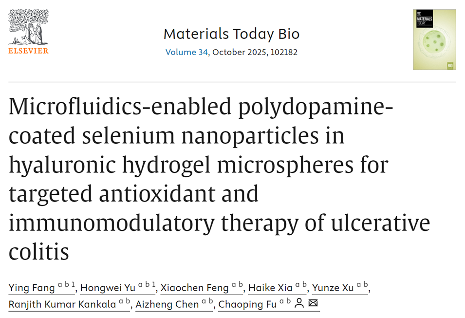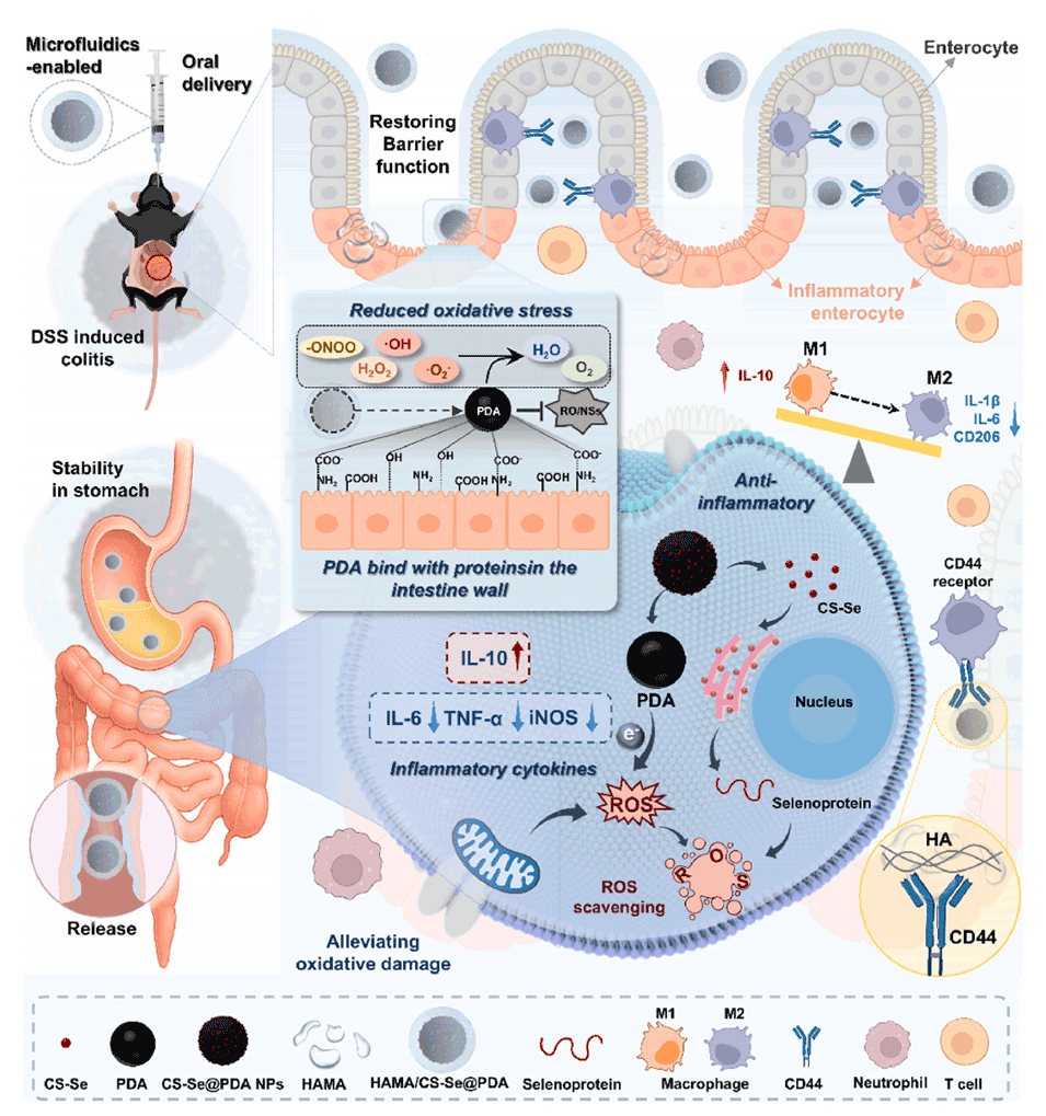 溃疡性结肠炎(UC)表现为结肠微环境中过度氧化应激和免疫失调。针对这些病理特征,华侨大学傅超萍副教授团队开发了一种微流控技术制备的口服递送系统,该系统由甲基丙烯酸酯化透明质酸水凝胶微球封装聚多巴胺包覆的硒纳米颗粒构成,兼具抗氧化和免疫调节功能,能靶向作用于发炎结肠组织并有效缓解病症。相关研究以“Microfluidics-enabled polydopamine-coated selenium nanoparticles in hyaluronic hydrogel microspheres for targeted antioxidant and immunomodulatory therapy of ulcerative colitis”为题目,发表在期刊《Materials Today Bio》上。