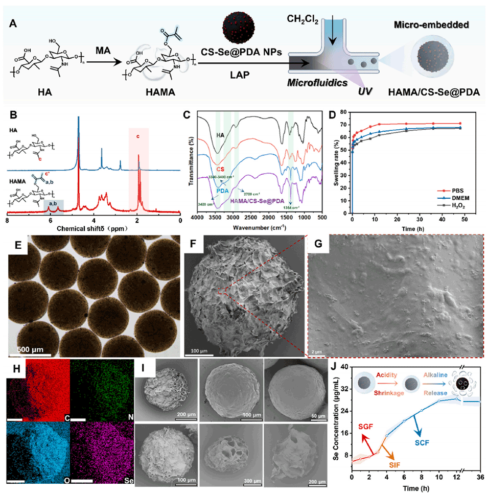 图 3. HAMA/CS-Se@PDA 水凝胶微球的制备及理化特性表征。(A)HAMA/CS-Se@PDA 的合成过程。(B)透明质酸(HA)和甲基丙烯酸酯化透明质酸(HAMA)的 ¹H 核磁共振(NMR)谱,显示甲基丙烯酸酯化后出现乙烯基质子和甲基峰。(C)硫酸软骨素(CS)、聚多巴胺(PDA)、HAMA 及 HAMA/CS-Se@PDA 微球的傅里叶变换红外(FTIR)光谱,识别特征官能团振动。(D)HAMA 水凝胶在 PBS(pH 7.4)中 24 小时的溶胀曲线。(E)HAMA/CS-Se@PDA 微球的光学显微镜图像,显示均匀的球形形态。(F)冷冻干燥微球的扫描电镜(SEM)图像,显示致密的球形结构。(G)高倍 SEM 图像,突出表面锚定的纳米颗粒。(H)微球的能量色散 X 射线光谱(EDS) ,显示 C、N、O、S 和 Se 元素的均匀分布(比例尺:100 μm)。(I)经模拟胃液(SGF)处理不同时间点(0、2、4、6、8、10 小时)的微球 SEM 图像,显示表面形态变化。(J)通过电感耦合等离子体质谱(ICP-MS)测定的微球在模拟胃液(SGF)、模拟肠液(SIF)和模拟结肠液(SCF)pH 条件下的硒释放曲线。