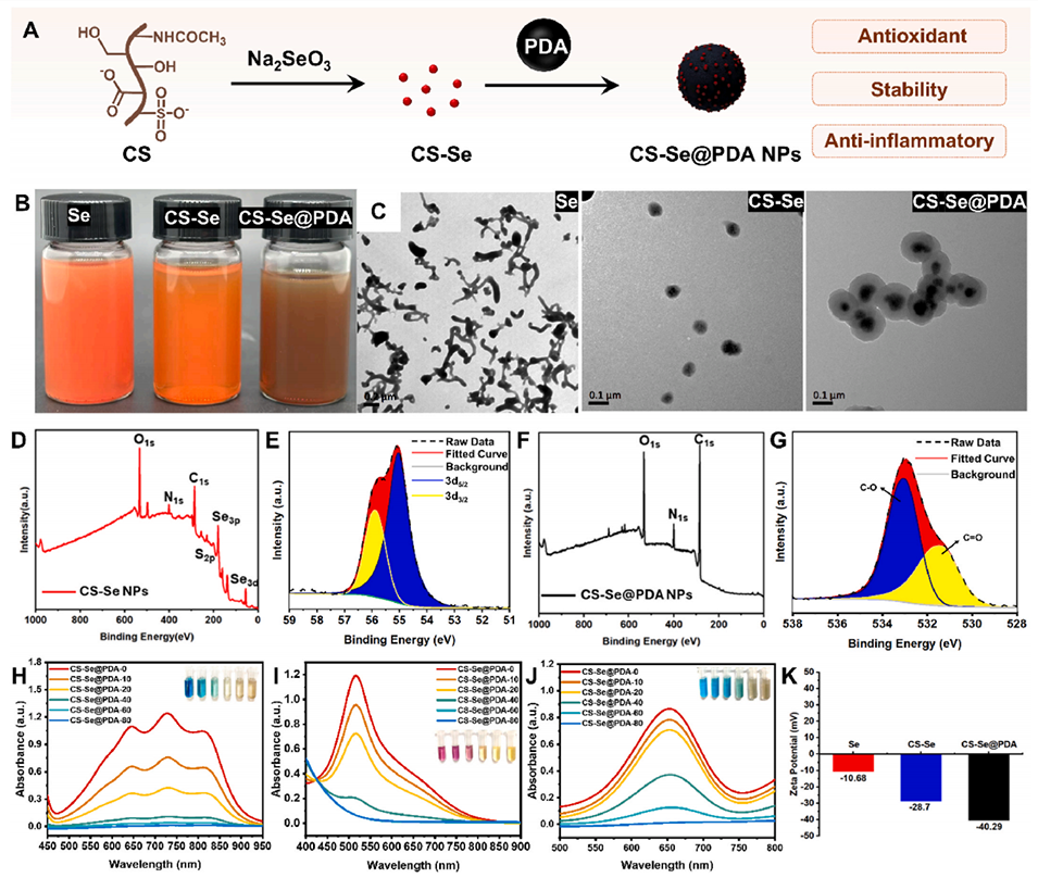 图 2. CS-Se@PDA 纳米颗粒的理化特性表征。(A)CS-Se@PDA 纳米颗粒的合成过程。(B)硒(Se)、CS-Se 及 CS-Se@PDA 纳米颗粒的光学图像。(C)Se、CS-Se 及 CS-Se@PDA 纳米颗粒的透射电镜(TEM)图像,显示经 CS 和 PDA 修饰后,颗粒从聚集的棒状转变为分散良好的球形。CS-Se 纳米颗粒的 X 射线光电子能谱(XPS)全谱(D),显示出 C 1s、N 1s、O 1s、S 2p 和 Se 3d 轨道的特征峰。CS-Se 纳米颗粒的高分辨率 Se 3d 谱(E),证实元素硒(Se⁰)的存在。CS-Se@PDA 纳米颗粒的 XPS 全谱(F),显示 C、N、O 的主要特征峰,而 PDA 层掩盖了 Se 和 S 的信号。高分辨率 O 1s 谱(G),表明与 C=O 相比,儿茶酚相关的 C-O 键大量存在,与 PDA 表面覆盖一致。(H-K)CS-Se 和 CS-Se@PDA 纳米颗粒对 ABTS⁺・(H)、DPPH・(I)和・OH(J)清除的紫外 - 可见吸收光谱,显示 PDA 修饰后抗氧化活性增强。Se、CS-Se 和 CS-Se@PDA 纳米颗粒的 zeta 电位测量(K),表明经 CS 和 PDA 功能化后胶体稳定性提高。