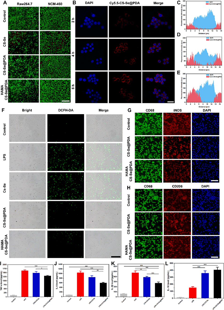 图 4. CS-Se@PDA 纳米颗粒和 HAMA/CS-Se@PDA 微球的体外生物相容性、细胞摄取及免疫调节评估。(A)NCM-460 和 RAW264.7 细胞与 CS-Se 纳米颗粒、CS-Se@PDA 纳米颗粒及 HAMA/CS-Se@PDA 微球共孵育 24 小时后的钙黄绿素 - AM / 碘化丙啶(Calcein AM/PI)染色,通过 Calcein-AM/PI 荧光观察。比例尺:100 μm。(B)共聚焦荧光图像显示 RAW264.7 细胞在孵育 2、4 和 6 小时后对 Cy5.5 标记的 CS-Se@PDA 纳米颗粒(红色)的时间依赖性摄取。比例尺:50 μm。(C-E)各时间点的相应半定量荧光强度分析,C)2 小时,D)4 小时,E)6 小时。(F)经脂多糖(LPS)刺激的 RAW264.7 细胞在经 CS-Se 纳米颗粒、CS-Se@PDA 纳米颗粒或 HAMA/CS-Se@PDA 微球处理后的细胞内活性氧(ROS)水平,采用 DCFH-DA 探针评估。比例尺:100 μm。(G、H)巨噬细胞极化标志物的免疫荧光染色:M1 表型的 CD68(绿色)和 iNOS(红色)(G);M2 表型的 CD68(绿色)和 CD206(红色)(H)。比例尺:100 μm。(I-L)LPS 刺激后细胞上清液中促炎和抗炎细胞因子的酶联免疫吸附测定(ELISA)定量:肿瘤坏死因子 -α(TNF-α)(I)、白细胞介素 - 6(IL-6)(J)、白细胞介素 - 1β(IL-1β)(K)和白细胞介素 - 10(IL-10)(L)。*p < 0.05,**p < 0.01,***p < 0.001。