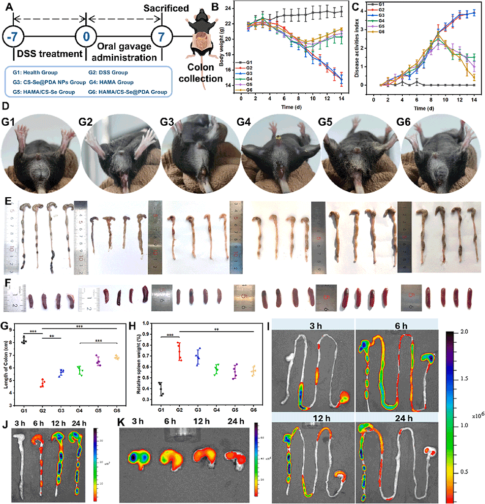 图 5. HAMA/CS-Se@PDA 水凝胶微球在葡聚糖硫酸钠(DSS)诱导的急性结肠炎小鼠模型中的体内治疗效果和结肠滞留性。(A)结肠炎诱导和口服治疗方案的时间线示意图。(B)实验期间小鼠的体重变化。(C)反映结肠炎临床严重程度的疾病活动指数(DAI)评分。(D)7 天 DSS 给药后小鼠肛周区域的代表性图像。(E)治疗后结肠组织的大体形态外观。(F)第 15 天收获的脾脏代表性图像。(G)各组结肠长度的定量分析。(H)归一化至体重的相对脾脏重量。(I)灌胃 Cy5.5 标记微球后 3、6、12 和 24 小时胃肠道的离体近红外荧光图像。(J)结肠段中 Cy5.5 荧光强度的定量分析。(K)胃段中 Cy5.5 荧光强度的定量分析。**p < 0.01,***p < 0.001。