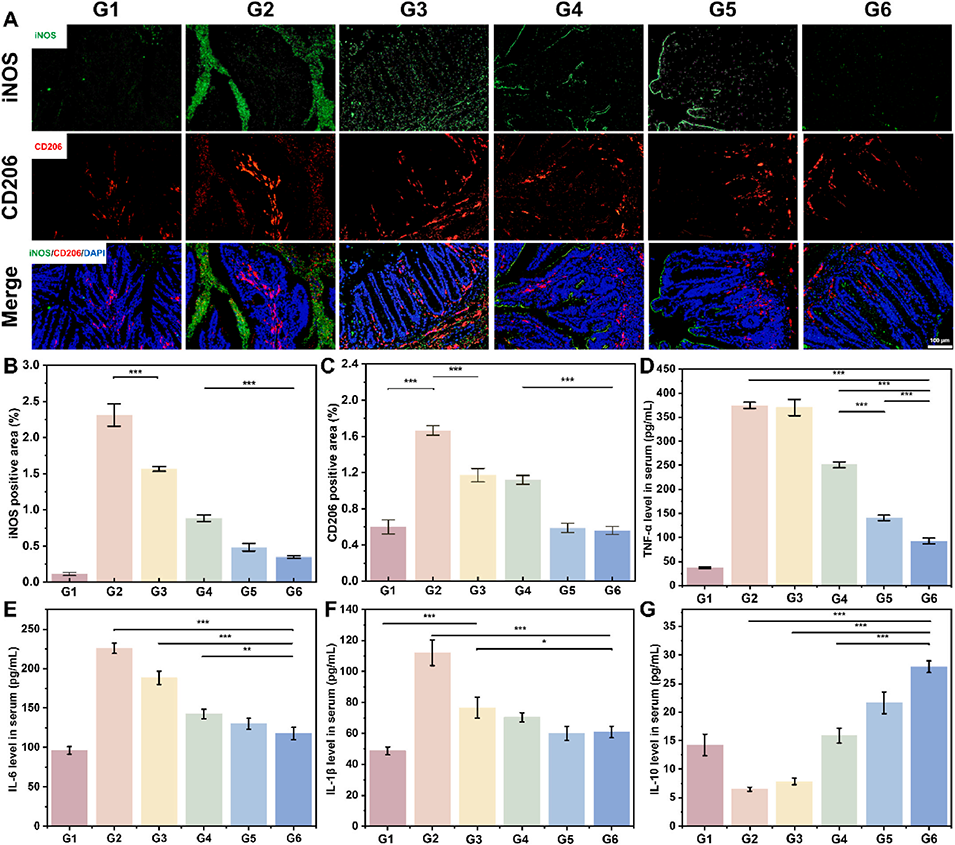 图 7. HAMA/CS-Se@PDA 微球在 DSS 诱导的急性结肠炎小鼠中的体内免疫调节评估。(A)结肠组织中巨噬细胞极化标志物的免疫荧光染色,显示 M1 表型(iNOS,红色)和 M2 表型(CD206,绿色)。(B)M1 标志物(iNOS)荧光区域的半定量分析。(C)M2 标志物(CD206)荧光区域的半定量分析。(D-G)治疗后小鼠血清中炎症细胞因子水平的定量分析,包括肿瘤坏死因子 -α(TNF-α)(D)、白细胞介素 - 6(IL-6)(E)、白细胞介素 - 1β(IL-1β)(F)和抗炎细胞因子白细胞介素 - 10(IL-10)(G),通过 ELISA 测定。*p < 0.05,**p < 0.01,***p < 0.001。