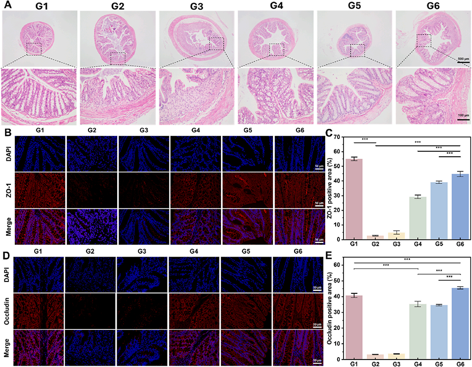 图 6. HAMA/CS-Se@PDA 水凝胶微球在 DSS 诱导的急性结肠炎小鼠中的治疗评估。(A)各组结肠组织的代表性苏木精 - 伊红(H&E)染色切片,显示炎症严重程度和组织结构。(B)结肠组织中 ZO-1 蛋白的免疫荧光染色,指示上皮紧密连接完整性。(C)ZO-1 荧光强度的定量分析。(D)结肠组织中闭合蛋白(Occludin)的免疫荧光染色。(E)Occludin 荧光强度的定量分析。**p < 0.01,***p < 0.001。