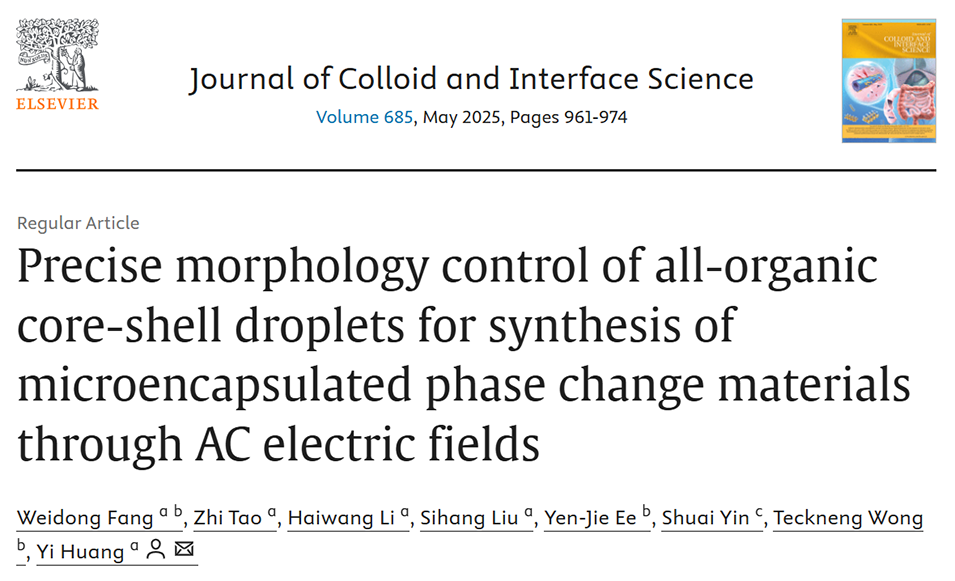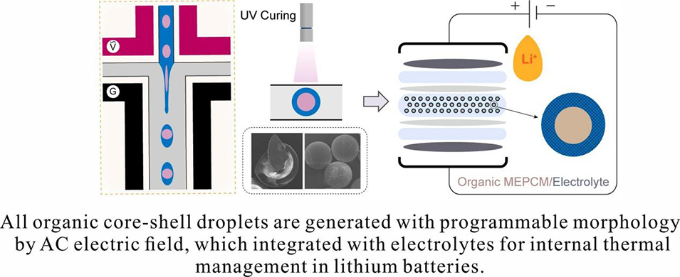 近期,北京航空航天大学航空发动机学院黄毅副教授团队通过将交流电场与双交叉结微通道相结合,实现了对全有机核壳液滴形态的精确控制,成功制备出微胶囊相变材料,并深入探究了其在锂电池热管理等领域的应用潜力。相关研究以“Precise morphology control of all-organic core-shell droplets for synthesis of microencapsulated phase change materials through AC electric fields”为题目,发表在期刊《Journal of Colloid and Interface Science》上。
