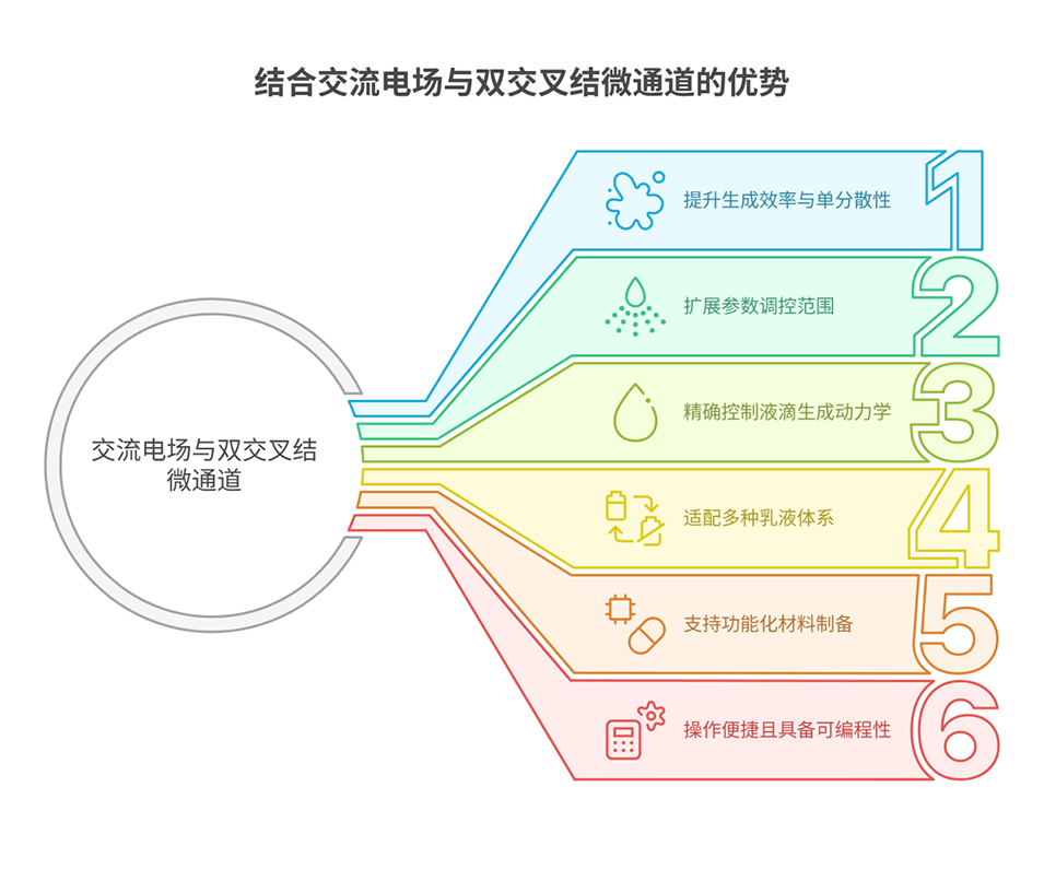 1、本研究通过将交流电场与双交叉结微通道相结合生成o/o/o乳液,基于电场力、粘性力和界面张力的相互作用,观察和分析乳液的生成动力学特征。