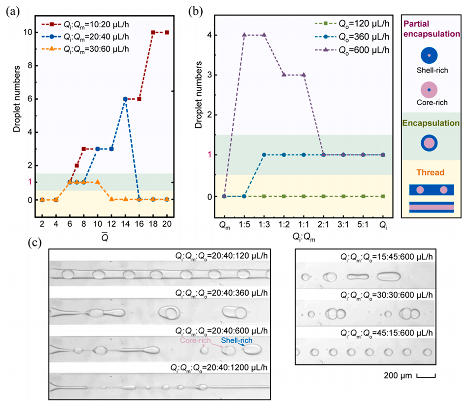 图 3. 不同流动条件下核壳液滴生成的流型图。(a)不同总流速(Qi + Qm)下无量纲参数`Q 的影响。(b)在(Qi + Qm)恒定为60 μL/h以及不同外相流速Qo下Qi:Qm的影响。(c)相应的现象。