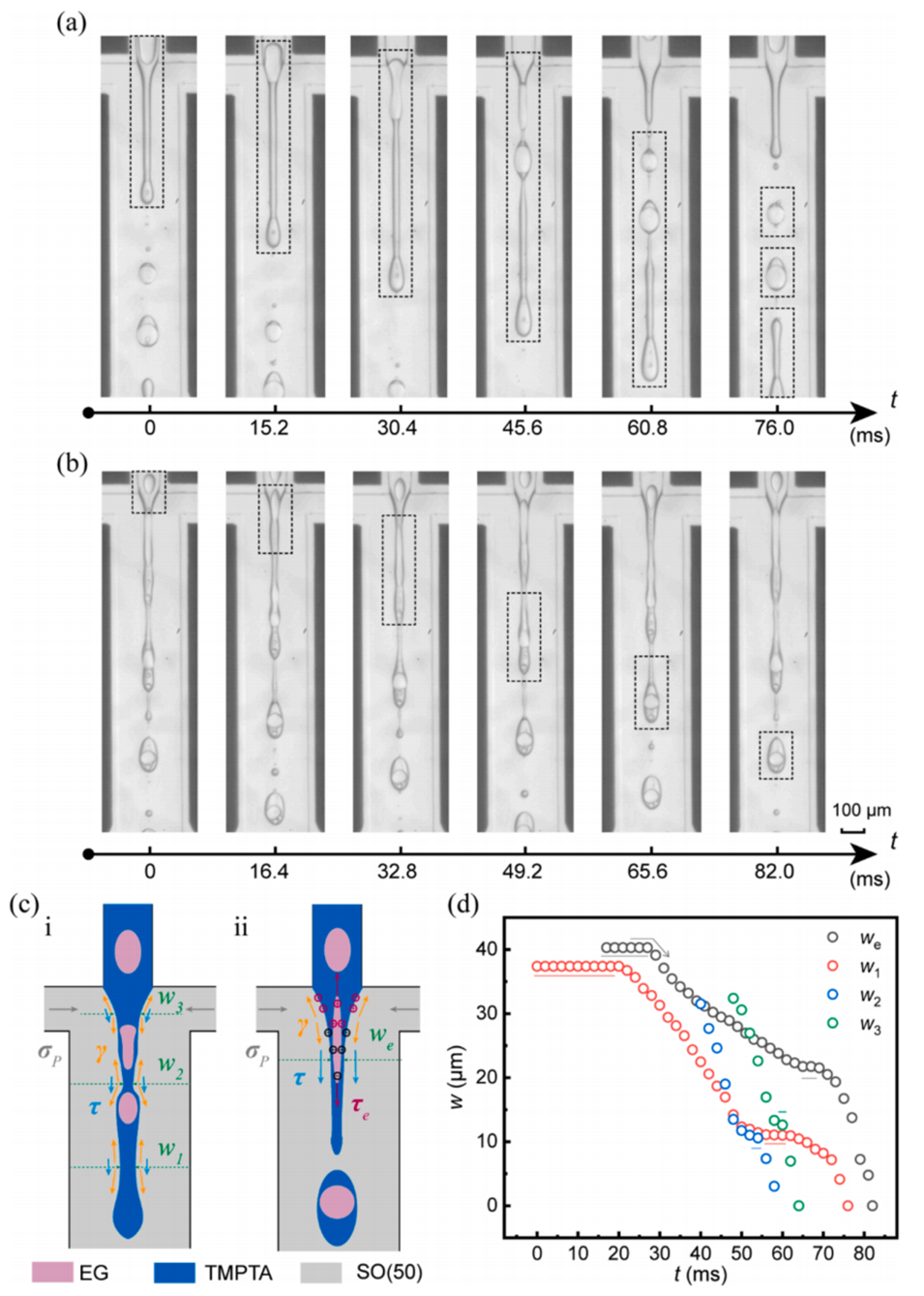 图 4. 当Qi:Qm:Qo为20:40:720 μL/h时的生成动力学分析。有无电场时生成过程的时间序列:(a)电压U为0 kV;(b)电压U为1 kV,频率f为100 Hz。内相液滴进入第二主通道前的帧定义为t=0。(c)液滴生成过程中的相应应力分析:i U=0 kV,ii U=1 kV,f=100 Hz。(d)液滴颈部变细的过程。