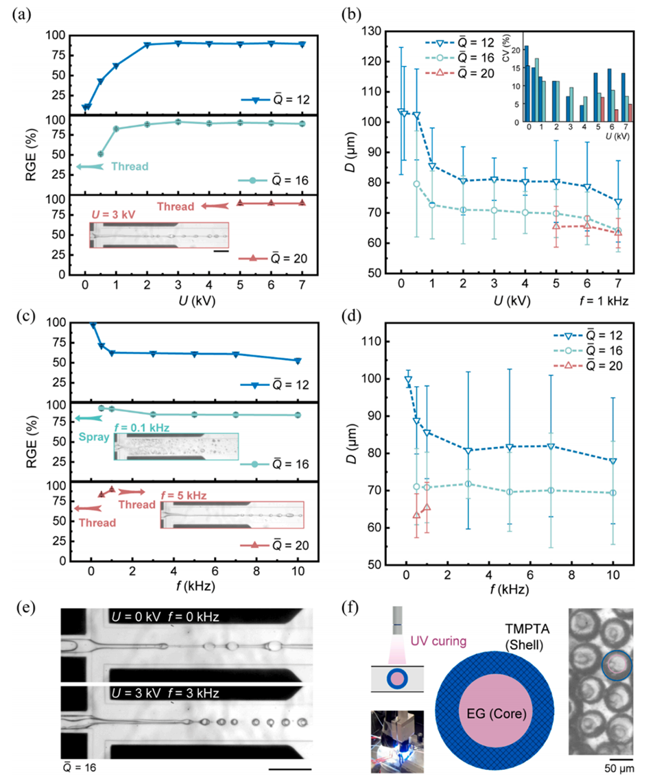 图 6. 当`Q为12、16和20,Qi:Qm为20:40 μL/h时,电学参数对RGE和D的影响。比例尺为300 μm。施加电压(U=0−7 kV)对(a)RGE和(b)D的影响;施加频率(f=0−10 kHz)对(c)RGE和(d)D的影响。当`Q为12、16和20时,电压U分别设定为1 kV、3 kV和5 kV。(e)当`Q=16时电学条件的优化。(f)通过紫外固化在芯片上制备核壳结构。