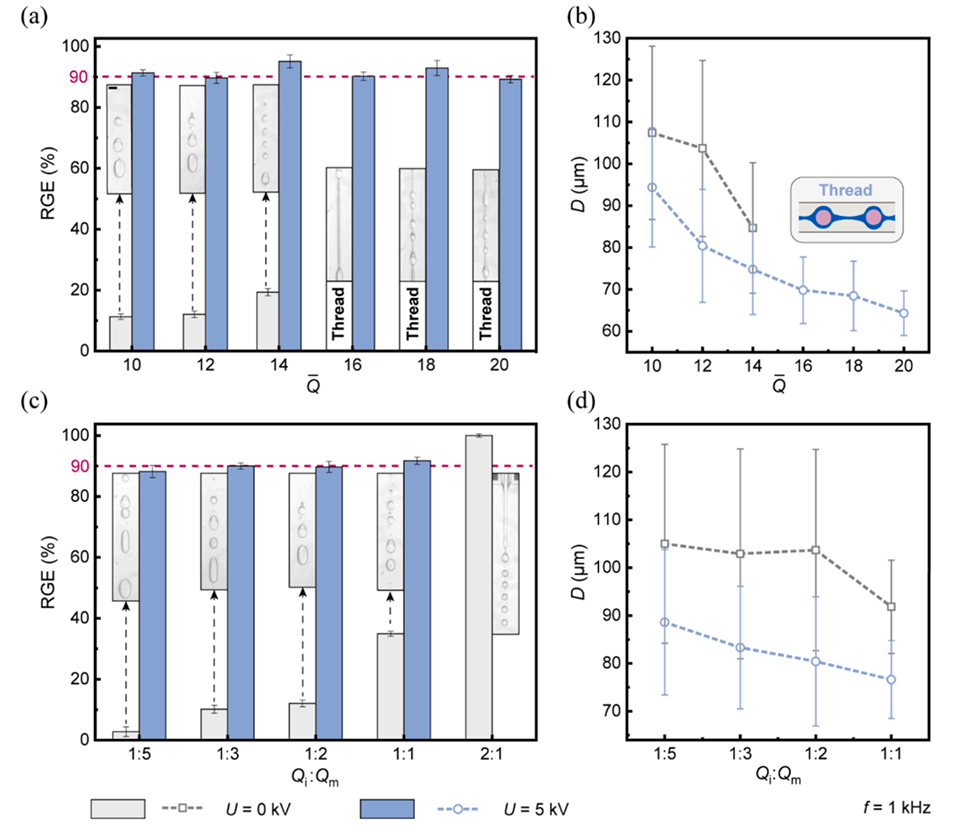 图 5. 有无电场时流动条件对相对生成效率(RGE)和等效直径(D)的影响。当Qi:Qm为20:40 μL/h时,无量纲参数`Q 对(a)RGE和(b)D的影响。在`Q=12时,流速比Qi:Qm对(c)RGE和(d)D的影响。比例尺为100 μm。