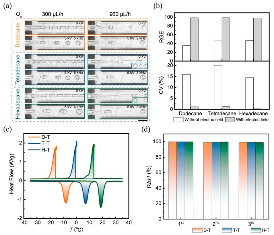 图 8. 微胶囊相变材料(MEPCMs)的电辅助制备。(a)当Qi:Qm为20:40 μL/h时,十二烷、十四烷和十六烷的核壳液滴电辅助生成过程。(b)当外相流速Qo=960 μL/h时,RGE和变异系数(CV)的提升情况。(c)D-T、T-T和H-T相变材料的差示扫描量热(DSC)曲线。(d)多次循环后的相变潜热。