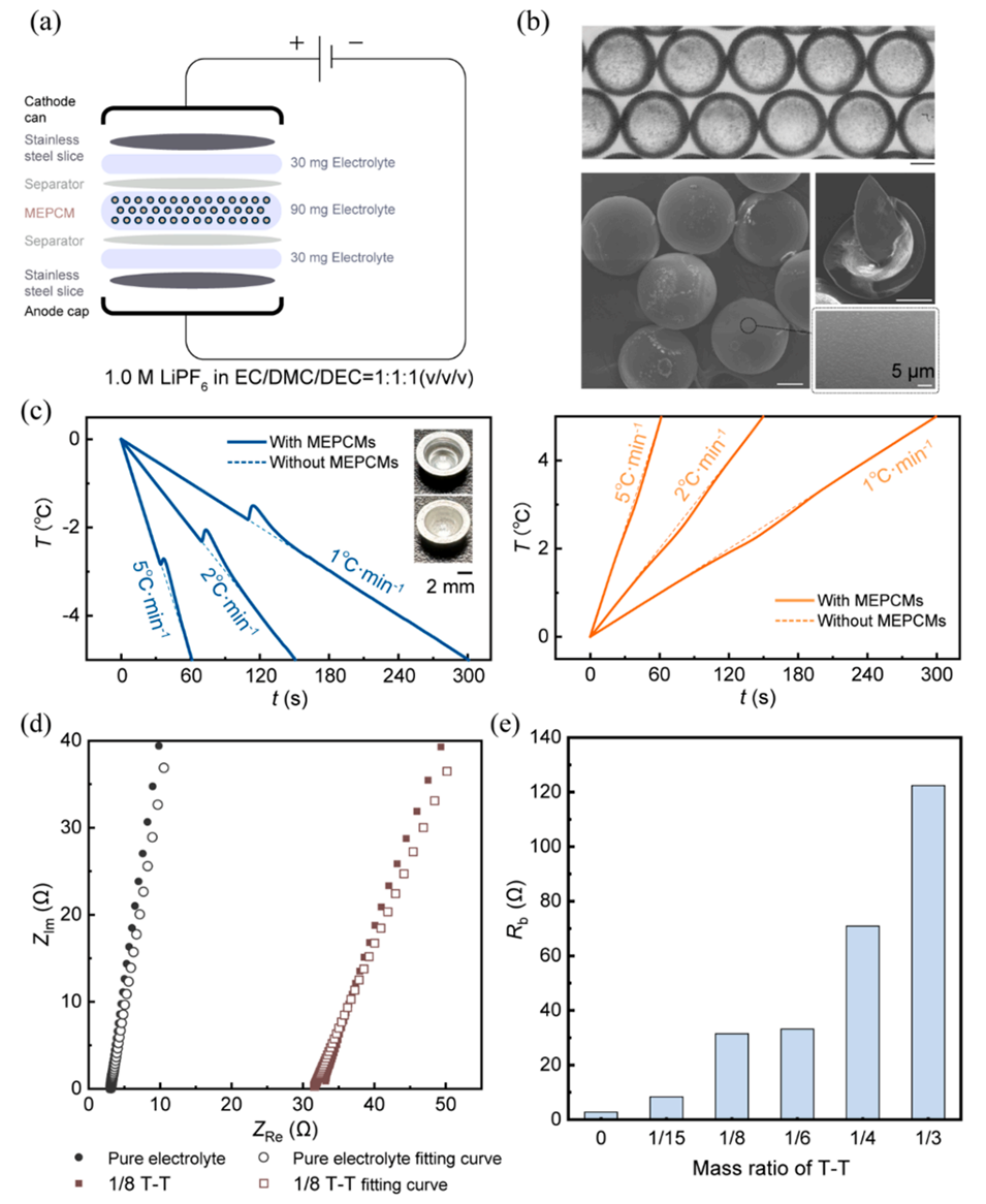 图 9. 利用MEPCMs进行电池热管理。(a)MEPCMs添加到电解质中的示意图。(b)核壳结构的光学显微镜和扫描电镜(SEM)图像,其他比例尺为50 μm。(c)有无MEPCMs时电解质的冷却和加热过程。(d)纯电解质和1/8比例T-T的阻抗分析。(e)电池电阻Rb随T-T有机MEPCMs不同质量比的变化。