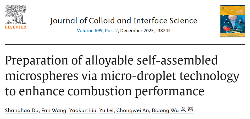 基于这一反应特性,近期中北大学武碧栋副教授团队进一步创新制备工艺,采用微液滴技术成功制备出B /钛(Ti)/氧化铜(CuO)自组装延期药微球,并系统探究了Ti粉添加量(0%-20%)对微球微观结构、热性能及燃烧行为的影响,为硼基延期药的配方优化与制备工艺提供了重要参考。相关研究以“Preparation of alloyable self-assembled microspheres via micro-droplet technology to enhance combustion performance”为题目,发表在期刊《Journal of Colloid and Interface Science》上。