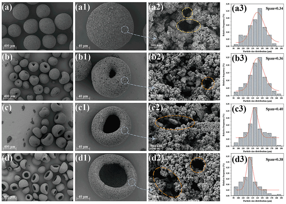 图 2:样品的扫描电镜(SEM)图像与粒度分布图:(a-d)分别代表 Ti-0% 至 Ti-20% 的样品;(a1-d1)为对应样品的单颗粒图像;(a2-d2)为对应样品的局部放大图像;(a3-d3)为对应样品的粒度分布统计