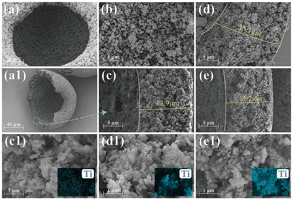 图 4:样品的内部结构与能谱(EDS)分析图:(a)Ti-20% 样品的整体图像;(a1)Ti-20% 样品的半球形结构图像;(b-e)Ti-0% 至 Ti-20% 样品的截面放大图像;(c1-e1)Ti-5% 至 Ti-20% 样品的高倍放大图像及 EDS 元素分布图像