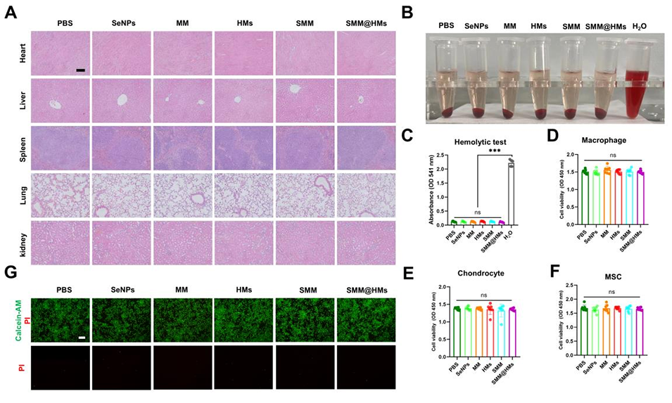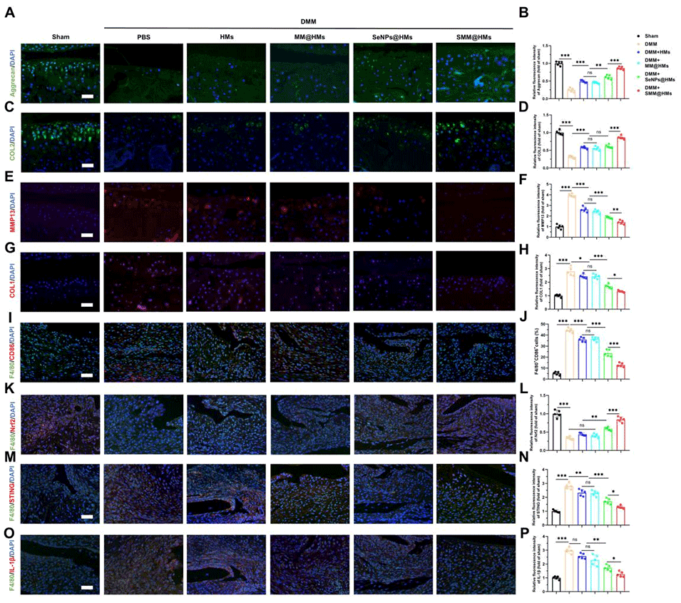 5、在软骨细胞层面,经SMM@HMs处理的M1型巨噬细胞所制备的条件培养基,可减轻软骨细胞的氧化应激、线粒体功能障碍与凋亡,同时维持细胞外基质(ECM)代谢稳态。体内实验结果证实,SMM@HMs能减少M1型巨噬细胞浸润,减轻软骨退变。