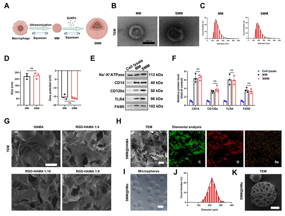 1、本研究通过膜挤出技术提取巨噬细胞膜(MM),随后包裹硒纳米颗粒(SeNPs),构建出仿生纳米颗粒(SMM),借助同源膜融合实现巨噬细胞靶向。