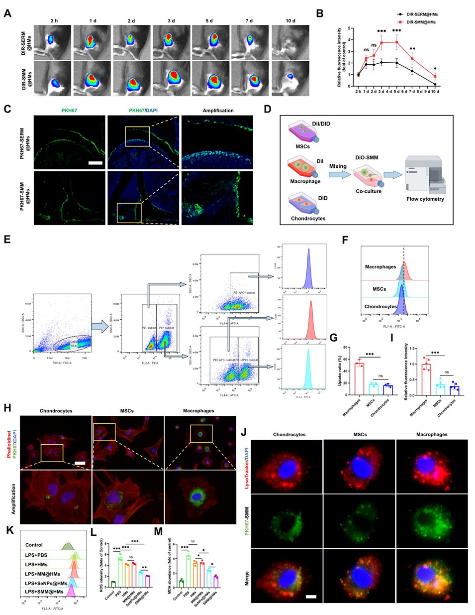 3、体内成像系统(IVIS)结果显示,SMM@HMs在关节内的滞留时间延长。释放出的SMM可特异性靶向巨噬细胞并清除活性氧(ROS),进而抑制巨噬细胞向M1型极化。
