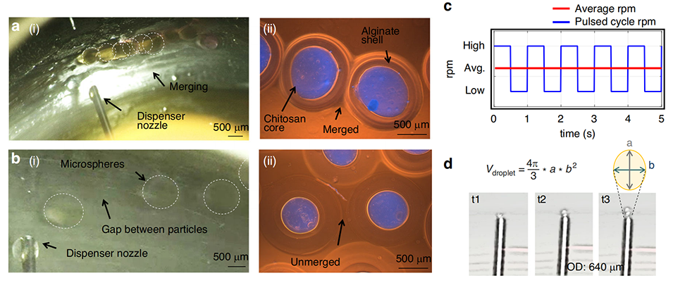 脉冲操作(转速的周期性变化)并没有尝试改变化学交联的速度(例如,更换交联离子或改变浓度),而是引入了欧拉力(Euler force)这一物理机制。通过突然的减速/加速,产生足够的流体扰动,将新生成的液滴从喷射点“推开”,人为地为其化学交联过程创造了所需的时间和空间上的隔离。