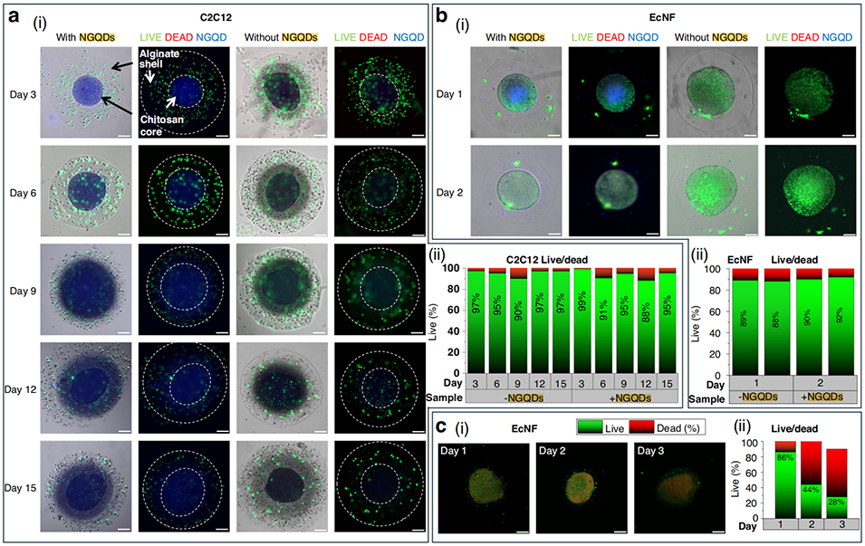 图 6 负载氮功能化石墨烯量子点(NGQDs)的核壳微球的细胞与细菌存活率分析