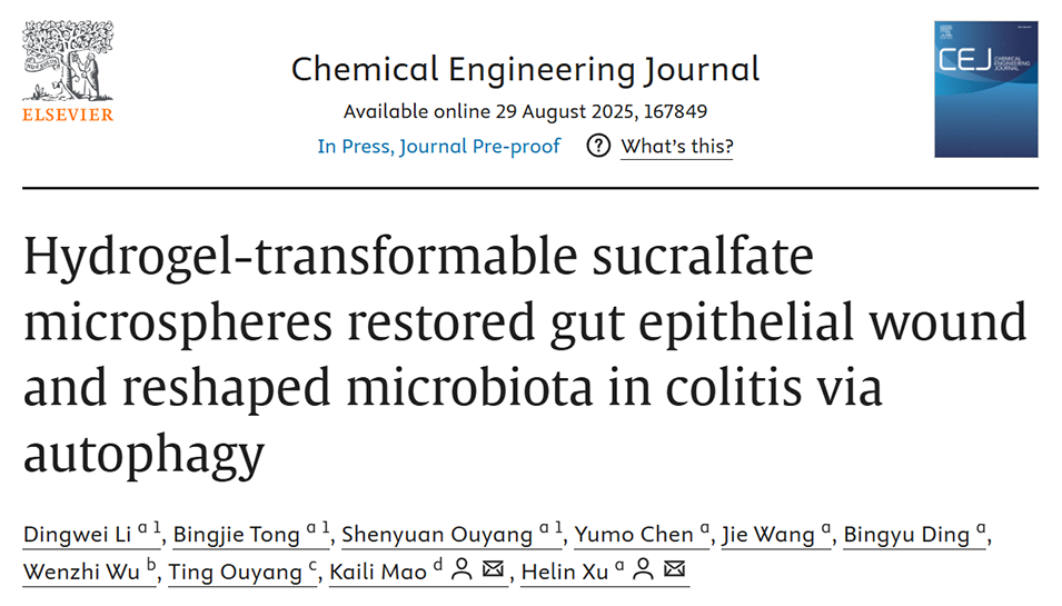 鉴于此,温州医科大学药学院徐荷林副教授团队联合温州医科大学附属衢州医院毛凯丽等人,成功开发了一种可转化为水凝胶的硫糖铝微球(HSM-TD)递送系统。该系统能够靶向结肠并在病灶处形成物理屏障,同时通过促进自噬修复肠上皮屏障并调节菌群平衡,为炎症性肠病提供了一种协同治疗新策略。相关研究以“Hydrogel-transformable sucralfate microspheres restored gut epithelial wound and reshaped microbiota in colitis via autophagy”为题目,发表在期刊《Chemical Engineering Journal》上。