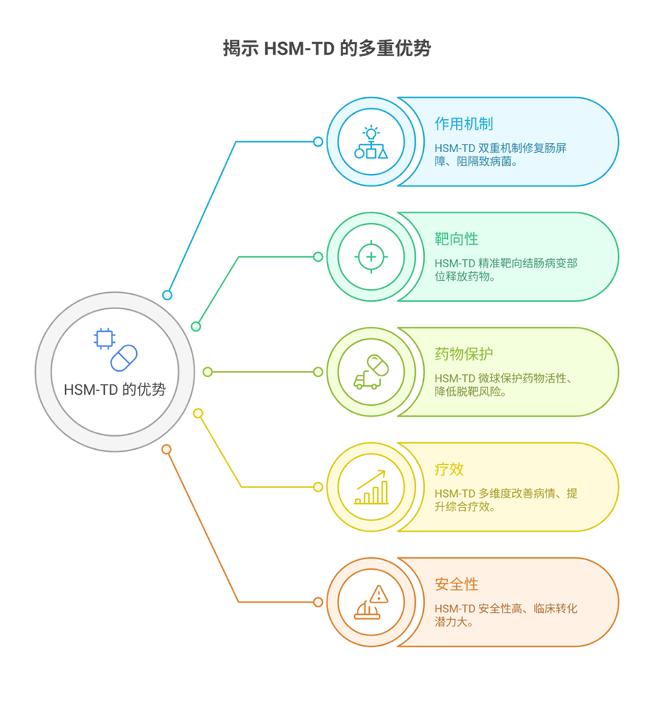 4、在DSS诱导的结肠炎小鼠中,HSM-TD显著优于游离TD或单独使用HSM,可有效缓解体重下降、降低疾病活动指数、恢复结肠长度、抑制炎症反应,并重塑肠道菌群、恢复菌群多样性及益生菌(如乳杆菌)的丰度。