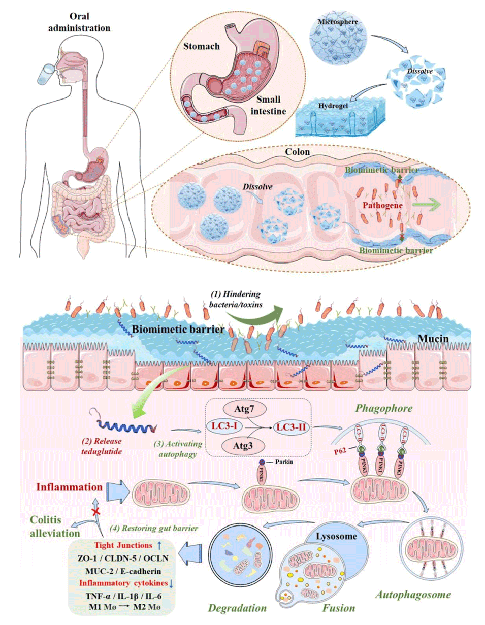 炎症性肠病(IBD)以肠道屏障破坏为主要特征,现有疗法多仅抑制炎症,难以修复黏液层和上皮紧密连接。传统硫糖铝依赖酸性环境起效,在肠道中性/弱碱性环境中失效,且无法主动促进黏膜愈合;替度鲁肽(TD)作为一种具有促进肠上皮修复作用的药物,易被胃肠酶降解,往往需要大剂量给药,从而增加了全身性暴露和脱靶效应的风险。