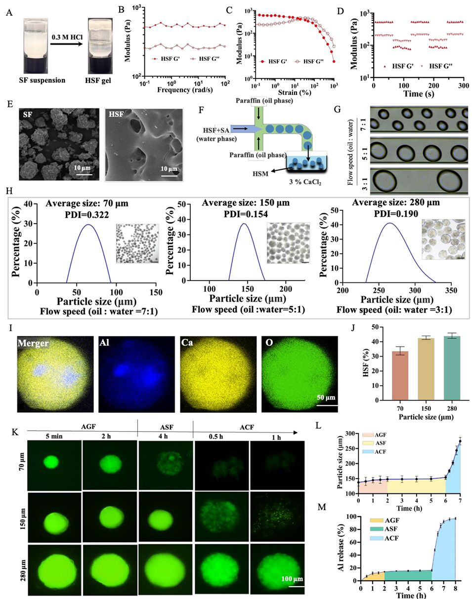 图2. HSM的制备与表征。呈现了盐酸改性硫糖铝(HSF)的制备过程、HSM的微流控制备工艺,以及对HSM的粒径分布、形貌、流变学特性、元素组成和药物载量等关键指标的表征结果。