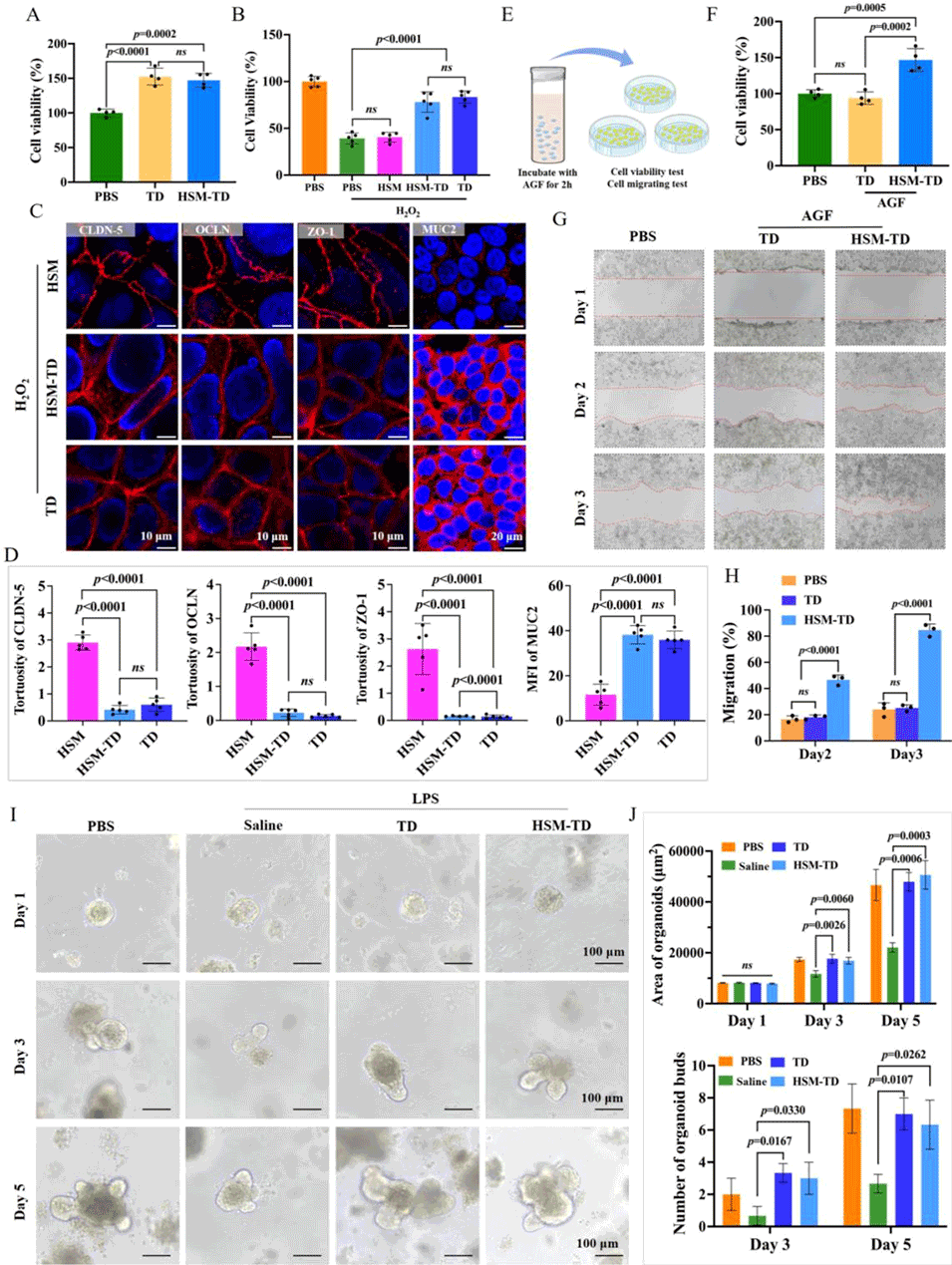 图6. HSM对替度鲁肽(TD)生物活性的保护作用。通过细胞增殖实验、划痕修复实验及肠类器官实验,验证HSM能保护TD不被胃液降解,维持其促进肠上皮细胞增殖、修复损伤细胞紧密连接和黏液分泌,以及逆转LPS对肠类器官生长抑制的生物活性。