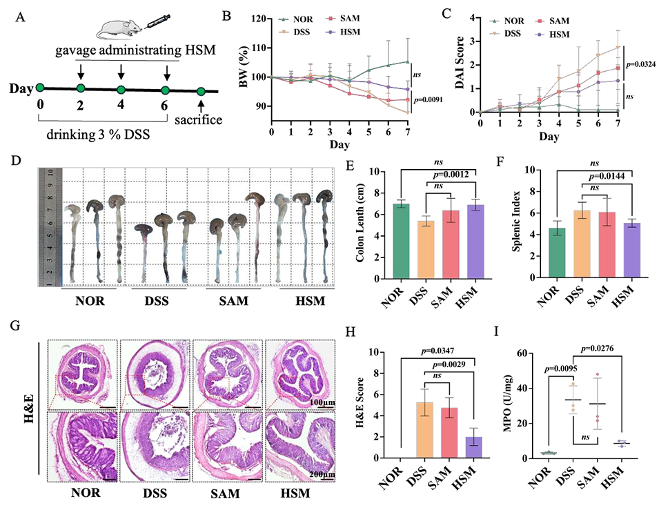图5. HSM缓解DSS诱导的小鼠溃疡性结肠炎。以DSS诱导的小鼠溃疡性结肠炎为模型,通过监测体重变化、疾病活动指数(DAI)、结肠长度、脾脏指数,结合H&E染色和髓过氧化物酶(MPO)活性检测,证明HSM能改善结肠炎小鼠的病理损伤,抑制炎症反应。