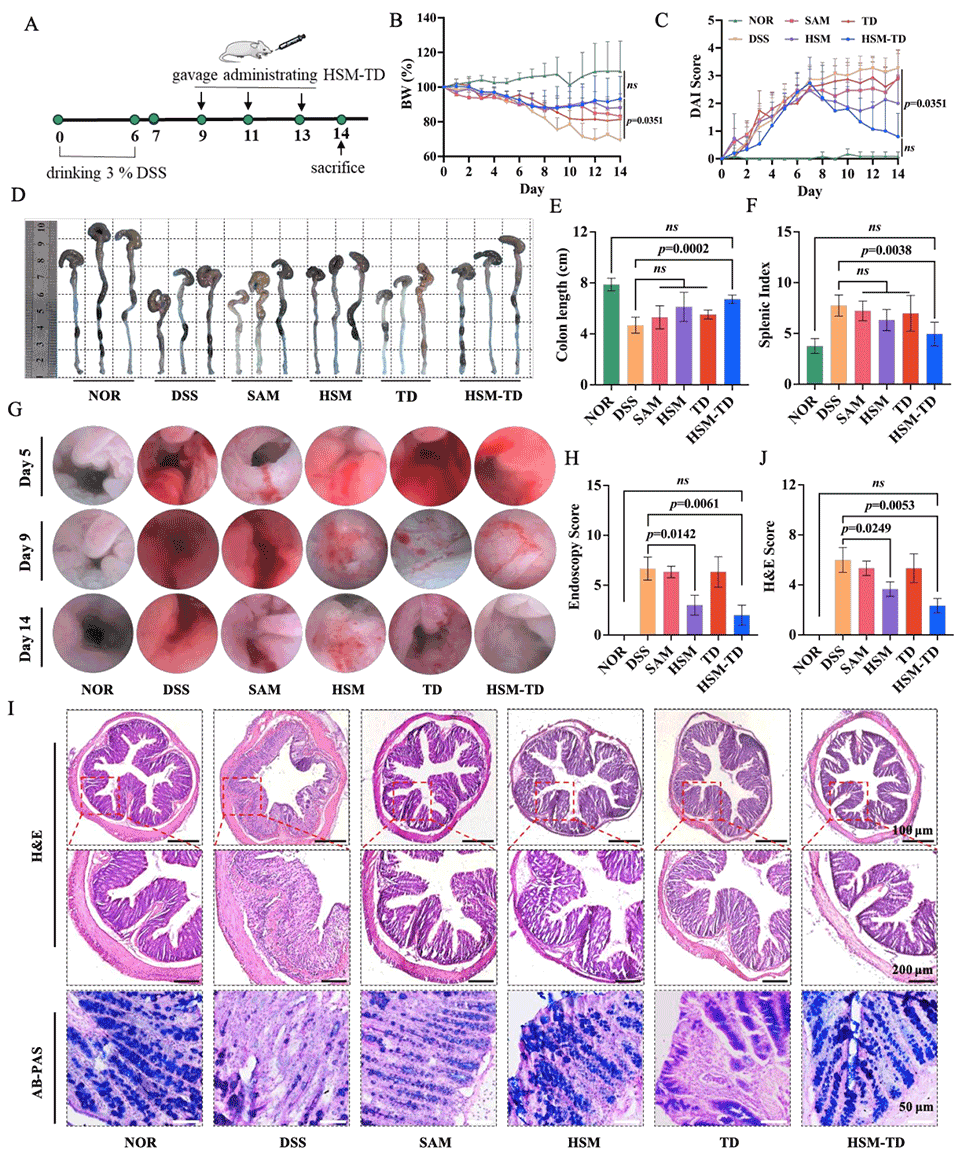图7. HSM-TD对DSS诱导结肠炎小鼠的治疗效果。对比HSM-TD与游离TD、单独HSM的疗效,发现HSM-TD能更显著改善结肠炎小鼠的体重下降、结肠缩短和DAI评分,通过内镜观察和组织病理学分析,证实其可促进黏膜愈合,降低炎症损伤程度。