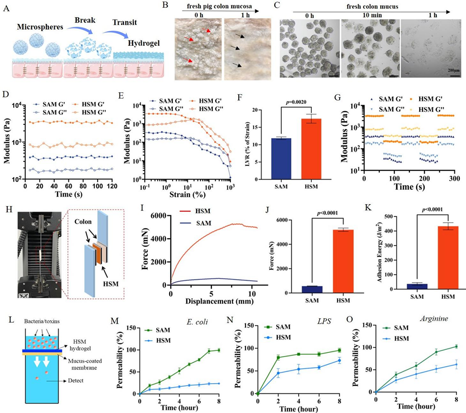 图3. HSM的微球-水凝胶转变及体外物理屏障功能。展示了HSM在结肠黏膜环境下从微球形态转变为水凝胶的过程,通过流变学测试验证了水凝胶的粘弹性和自修复能力,同时通过黏附力测试和体外渗透实验,证实了其强黏膜黏附性及对大肠杆菌、脂多糖(LPS)和精氨酸的阻隔作用。