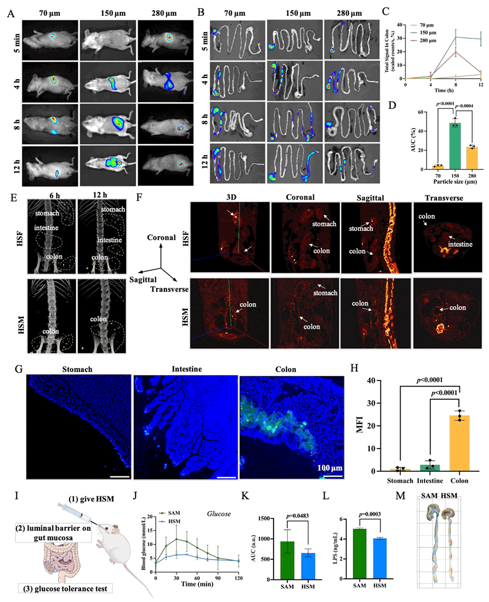 图4. 口服HSM在结肠黏膜原位形成物理屏障。通过体内荧光成像、Micro-CT成像及体外葡萄糖耐受实验等,直观呈现了HSM经口服后在小鼠胃肠道的分布情况,证实其能抵抗胃和小肠环境降解,在结肠黏膜滞留并形成仿生屏障,减少葡萄糖吸收和LPS入血,保护肠屏障功能。