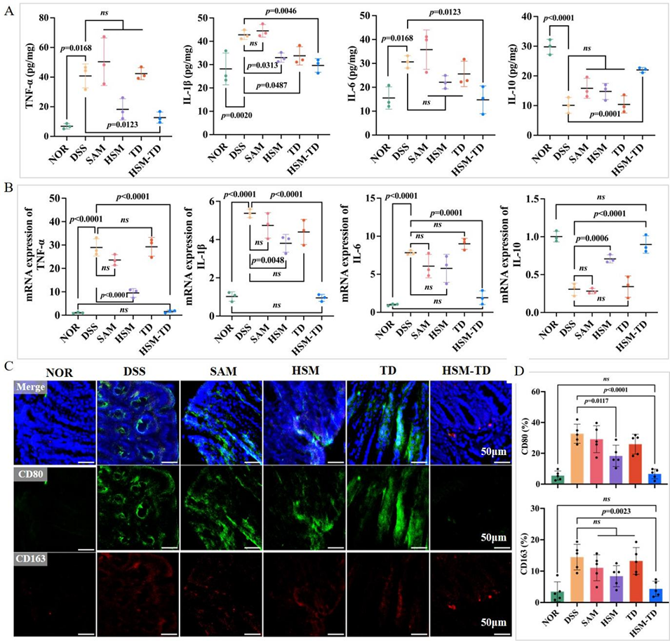 图8. HSM-TD通过调控巨噬细胞极化缓解肠道炎症反应。通过ELISA、qPCR及免疫荧光染色,检测到HSM-TD能降低结肠炎小鼠结肠组织中TNF-α、IL-1β等促炎细胞因子水平,升高IL-10抗炎因子水平,同时促进巨噬细胞从促炎M1型向抗炎M2型极化,减轻肠道炎症。