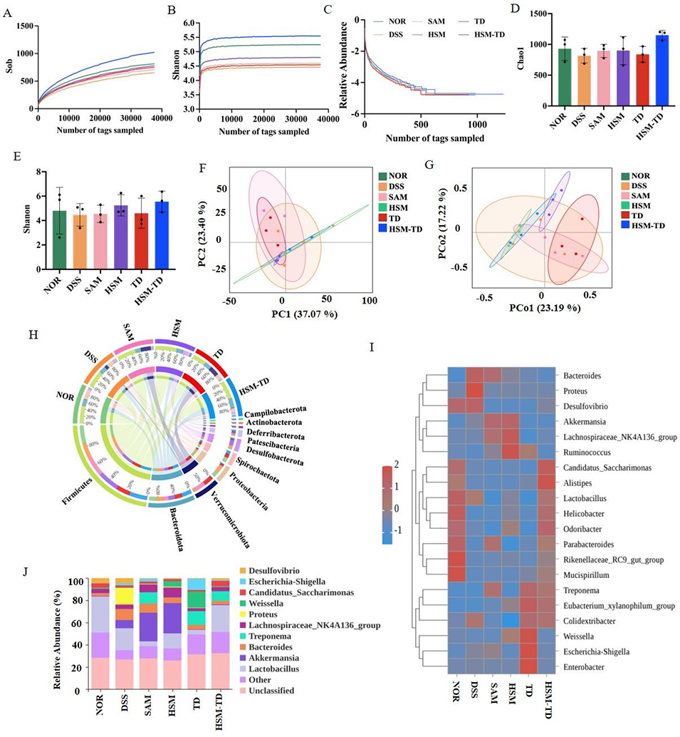 图10. HSM-TD调控肠道菌群。通过16S rDNA测序分析,发现HSM-TD能恢复DSS诱导结肠炎小鼠的肠道菌群多样性,调节菌群结构,如恢复厚壁菌门/变形菌门比值,富集乳杆菌等益生菌,抑制变形杆菌等致病菌增殖。