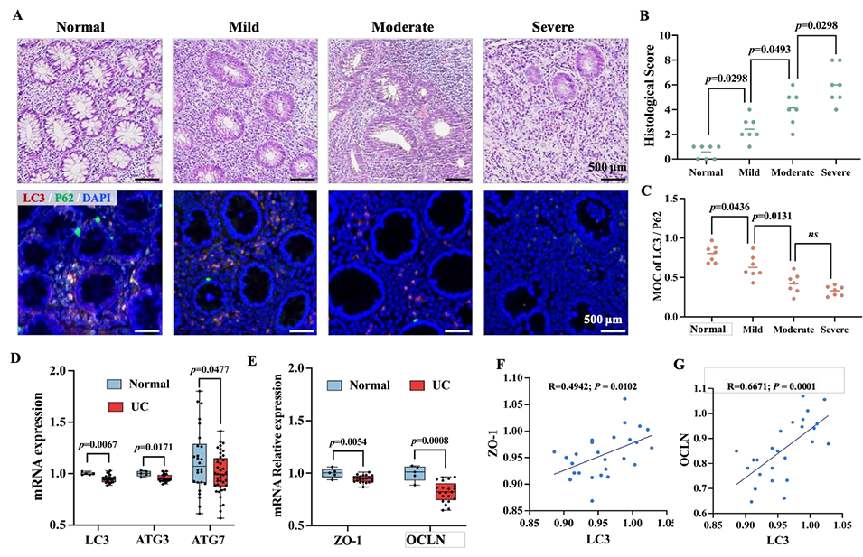 图11. 结肠炎患者结肠组织中自噬下调与肠道屏障完整性呈负相关。通过对溃疡性结肠炎患者结肠活检样本的免疫荧光染色及公共基因数据集(GSE9452)分析,发现患者病变组织中自噬标志物(LC3、Atg3/7)表达下调,且与紧密连接蛋白(ZO-1、OCLN)表达负相关,证实自噬缺陷与肠道屏障破坏密切相关。