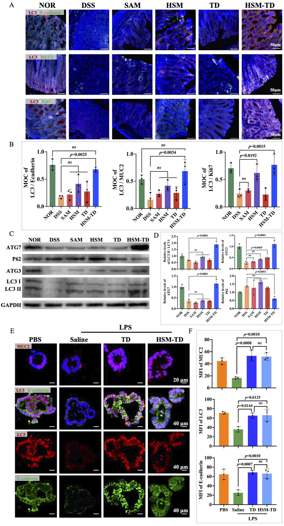 图12. HSM-TD增强肠上皮自噬。通过免疫荧光染色、Western blot和qPCR实验,显示HSM-TD能上调DSS诱导结肠炎小鼠肠上皮细胞中自噬标志物(LC3、Atg3/7)的表达,恢复肠上皮细胞和杯状细胞的自噬水平,同时改善线粒体功能,为肠屏障修复提供能量支持。