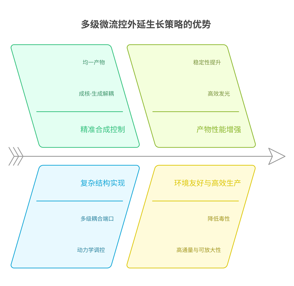 多级微流控外延生长策略的核心原理在于利用微流控芯片的多级空间构型与微尺度限域效应,实现对纳米晶成核、生长及异质外延过程的时空解耦与精准调控,具体如下: