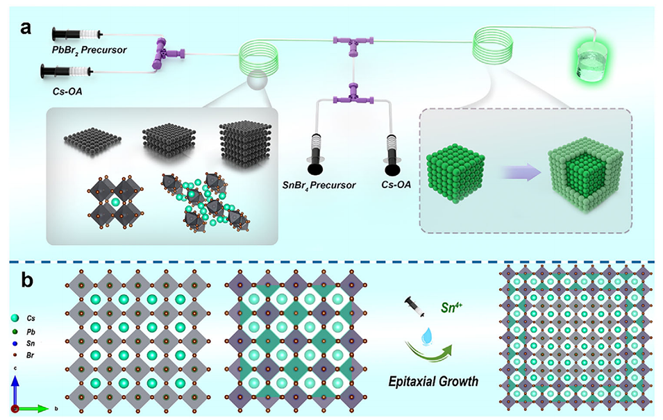 图1. 核壳结构钙钛矿纳米晶的多级微流控制备。a)用于精准调控CsPbBr₃纳米晶及分步合成CsPbBr₃/Cs₂SnBr₆核壳结构纳米晶的多级微流控平台示意图;b)在CsPbBr₃纳米晶表面外延生长壳层的示意图。