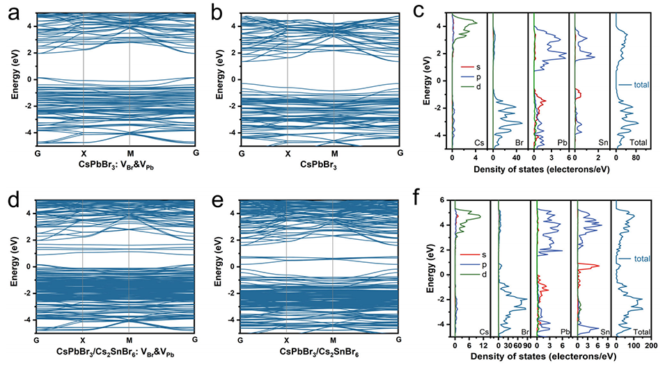 图7. 异质结钙钛矿纳米晶的电子结构演变。基于第一性原理计算得到的a)含铅空位与溴空位的CsPbBr₃(CsPbBr₃:VPb&VBr)、b)完美CsPbBr₃、d)含铅空位与溴空位的CsPbBr₃/Cs₂SnBr₆(CsPbBr₃/Cs₂SnBr₆:VPb&VBr)、e)完美CsPbBr₃/Cs₂SnBr₆(完美结构中铅空位被锡原子取代)的电子能带结构对比;c)完美CsPbBr₃、f)完美CsPbBr₃/Cs₂SnBr₆的部分态密度(DOS)图。