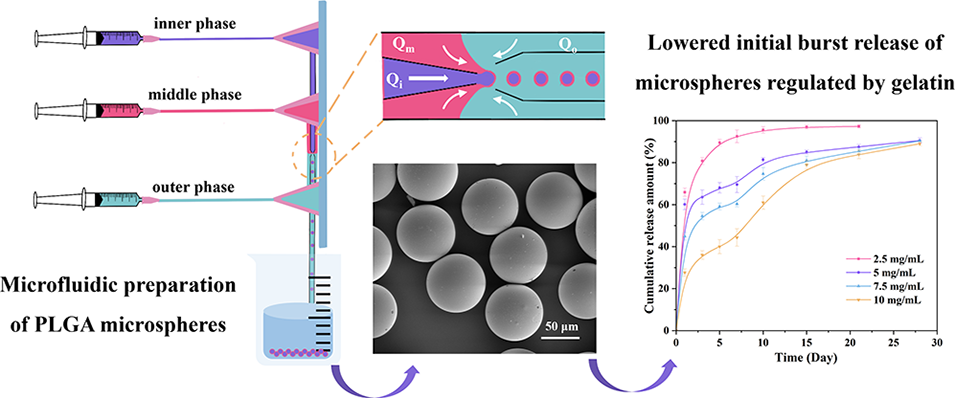 近期,华东理工大学奚桢浩教授、岑莲教授等人借助玻璃毛细管微流控装置构建水包油包水(W/O/W)乳液体系,成功制备出具有核壳结构的载醋酸亮丙瑞林(LA)聚乳酸-羟基乙酸共聚物(PLGA)微球,并系统探究了内水相明胶浓度、收集液pH值及LA浓度对微球包封率、载药量与体外释放性能的影响。相关研究以“Microfluidic Regulation of Core–Shell PLGA Microspheres for Sustained Release of Leuprolide Acetate”为题目,发表在期刊《Langmuir》上。