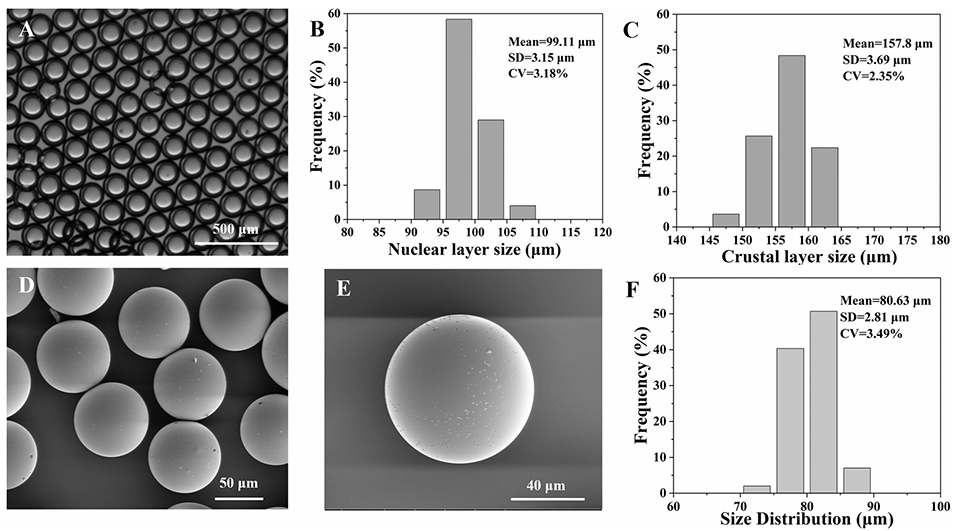 图2.(A)液滴的光学显微镜图像;液滴核(B)与壳(C)直径分布;LA-PLGA-MS的SEM图像(D, E)及直径分布(F)