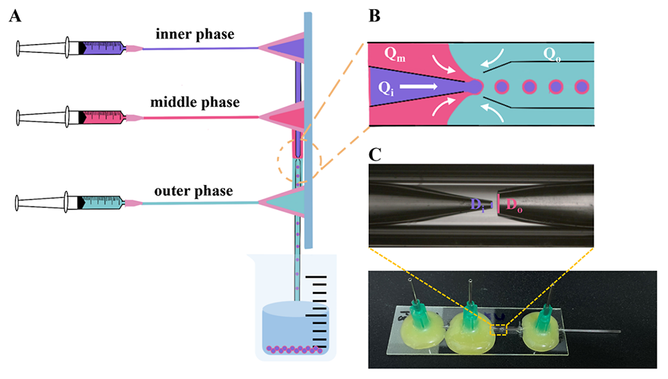 图1. W/O/W型PLGA微球的微流控制备。(A)毛细管微流控装置制备微球的示意图;(B)液滴形成过程(Qi:内相流体流速;Qm:中间相流体流速;Qo:外相流体流速);(C)毛细管微流控装置(Di:短管内径;Do:长管内径,Di/Do=1:3)