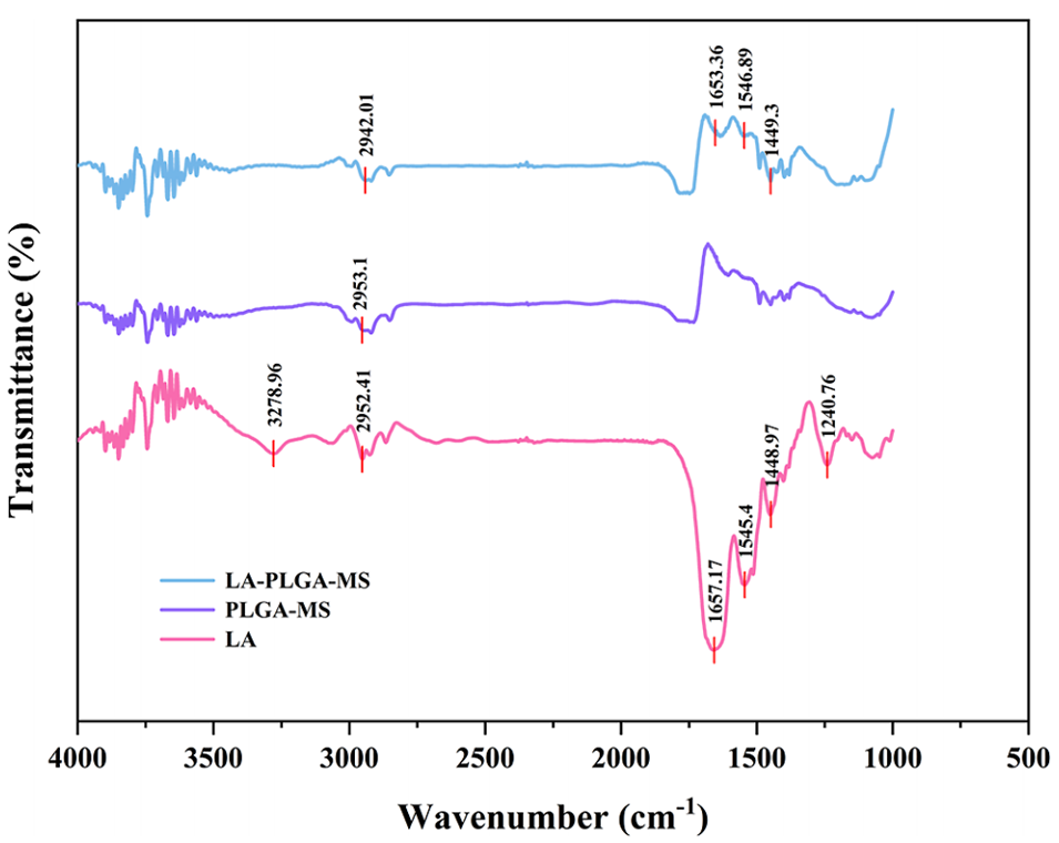 图4. LA-PLGA-MS、PLGA-MS与LA的傅里叶变换红外光谱(FT-IR)