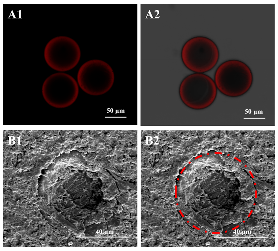 图3. NR-PLGA-MS的CLSM图像(A1:暗场图;A2:暗场/明场叠加图);LA-PLGA-MS的SEM横截面图像(B1)及红色圆圈标注边界的图像(B2)