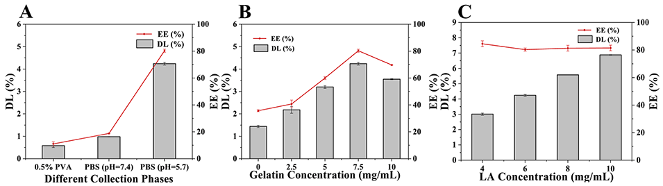 图5. 制备条件对微球包封率(EE)和载药量(DL)的影响。(A)不同收集液对微球EE和DL的影响(明胶浓度7.5mg/mL,LA浓度6mg/mL);(B)不同明胶浓度对微球EE和DL的影响(收集液为PBS,pH=5.7,LA浓度6mg/mL);(C)不同LA浓度对微球EE和DL的影响(收集液为PBS,pH=5.7,明胶浓度7.5mg/mL)。所有实验均重复3次,结果以平均值±标准差(n=3)表示
