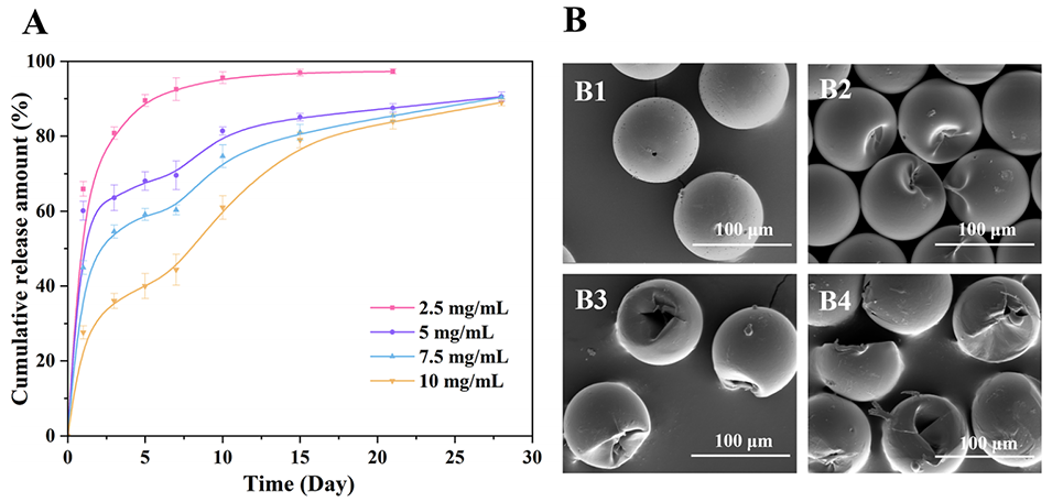 图7(A)不同明胶浓度制备LA-PLGA-MS的体外释放曲线(样品置于含0.02%吐温80的PBS中,pH=7.4,37℃,分别于0、1、3、5、7、10、15、21、28天取样);(B)明胶浓度7.5mg/mL的LA-PLGA-MS在37℃、PBS(pH=7.4)中的形态变化(B1:0天;B2:7天;B3:14天;B4:28天)